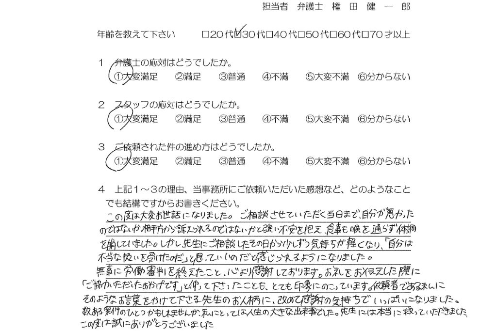 無事に労働審判を終えたこと、心より感謝しております。お礼を伝えた際に、「ご協力いただいたおかげです」と仰って下さったことも、とても印象に残っています。依頼者である私にそのような言葉をかけて下さる先生のお人柄に、改めて感謝の気持ちでいっぱいになりました。